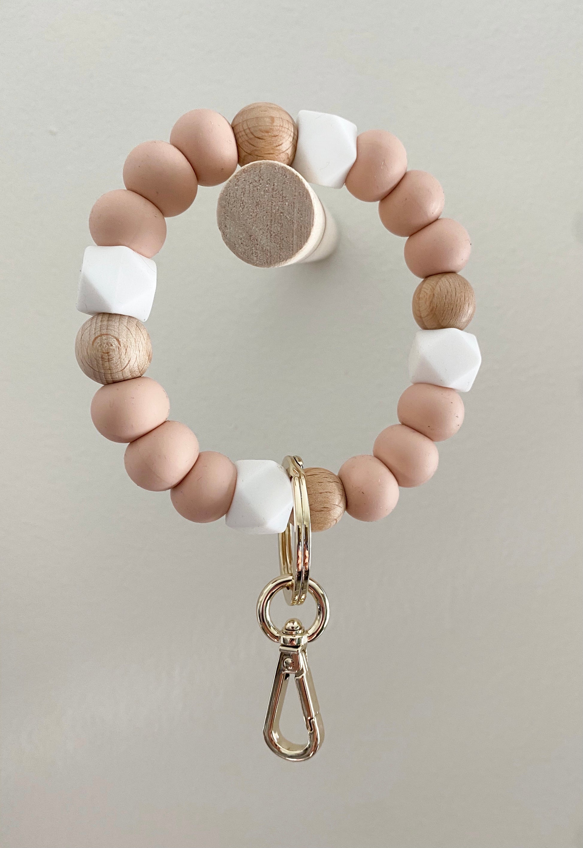 Thank you for your interest in a bracelet keychain. Never lose your keys again with this super functional piece. The main materials used in this item are food grade silicone beads- the perfect material to wipe down and sanitize.