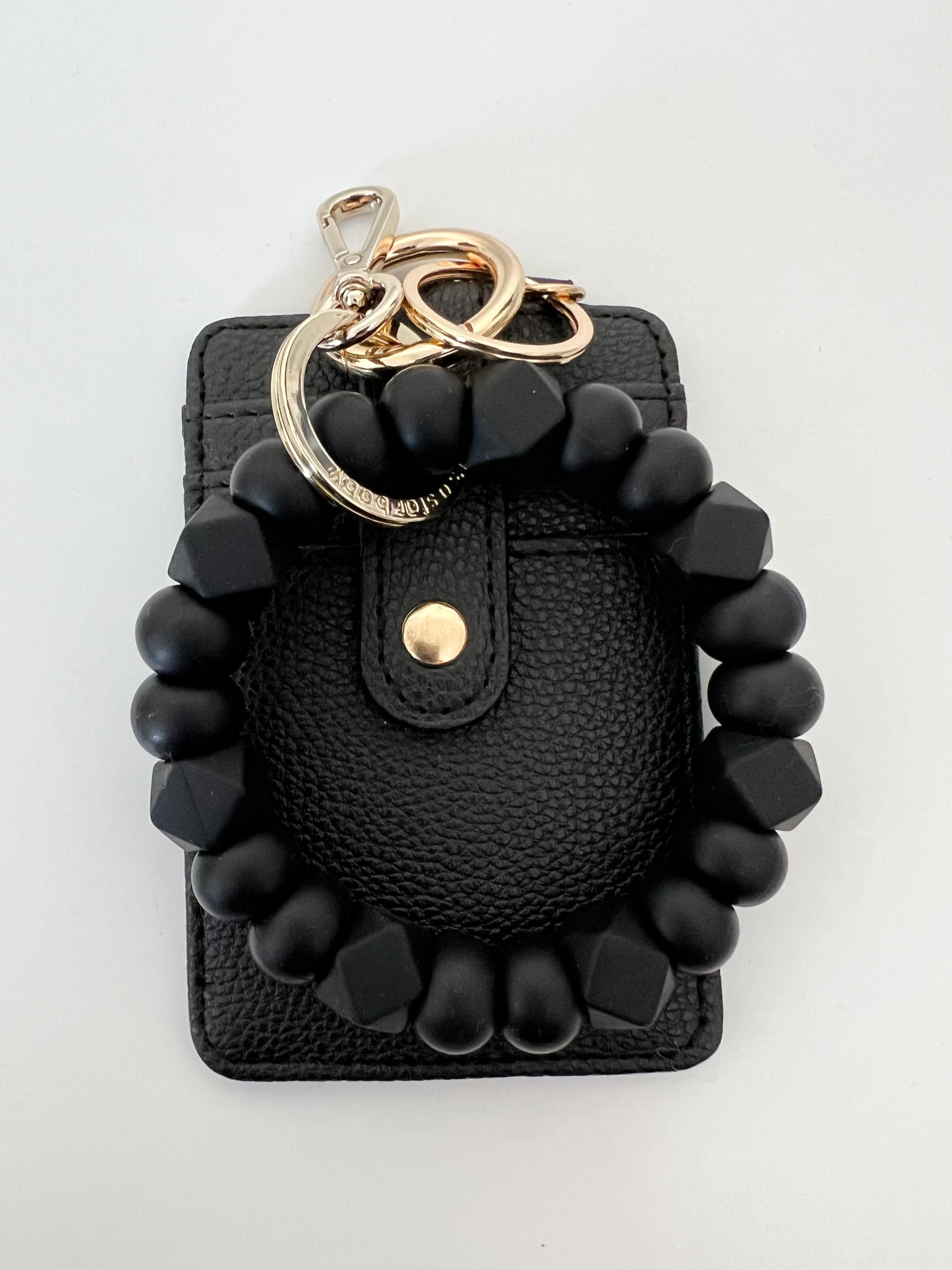 Thank you for your interest in a bracelet keychain. Never lose your keys again with this super functional piece. The main materials used in this item are food grade silicone beads- the perfect material to wipe down and sanitize.