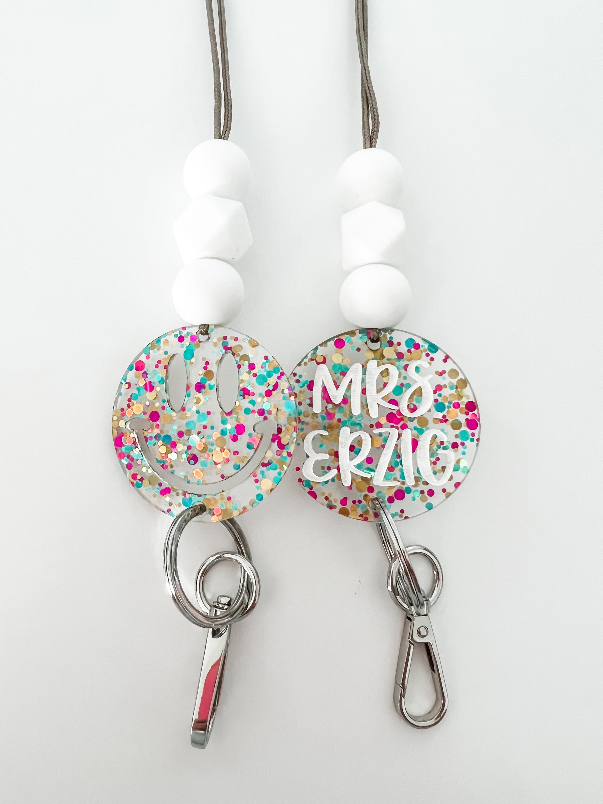 colorful confetti acrylic lanyard // personalized OR smiley