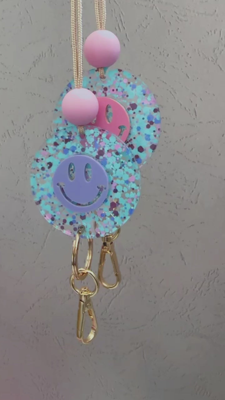 colorful purple & pink confetti acrylic smiley lanyard