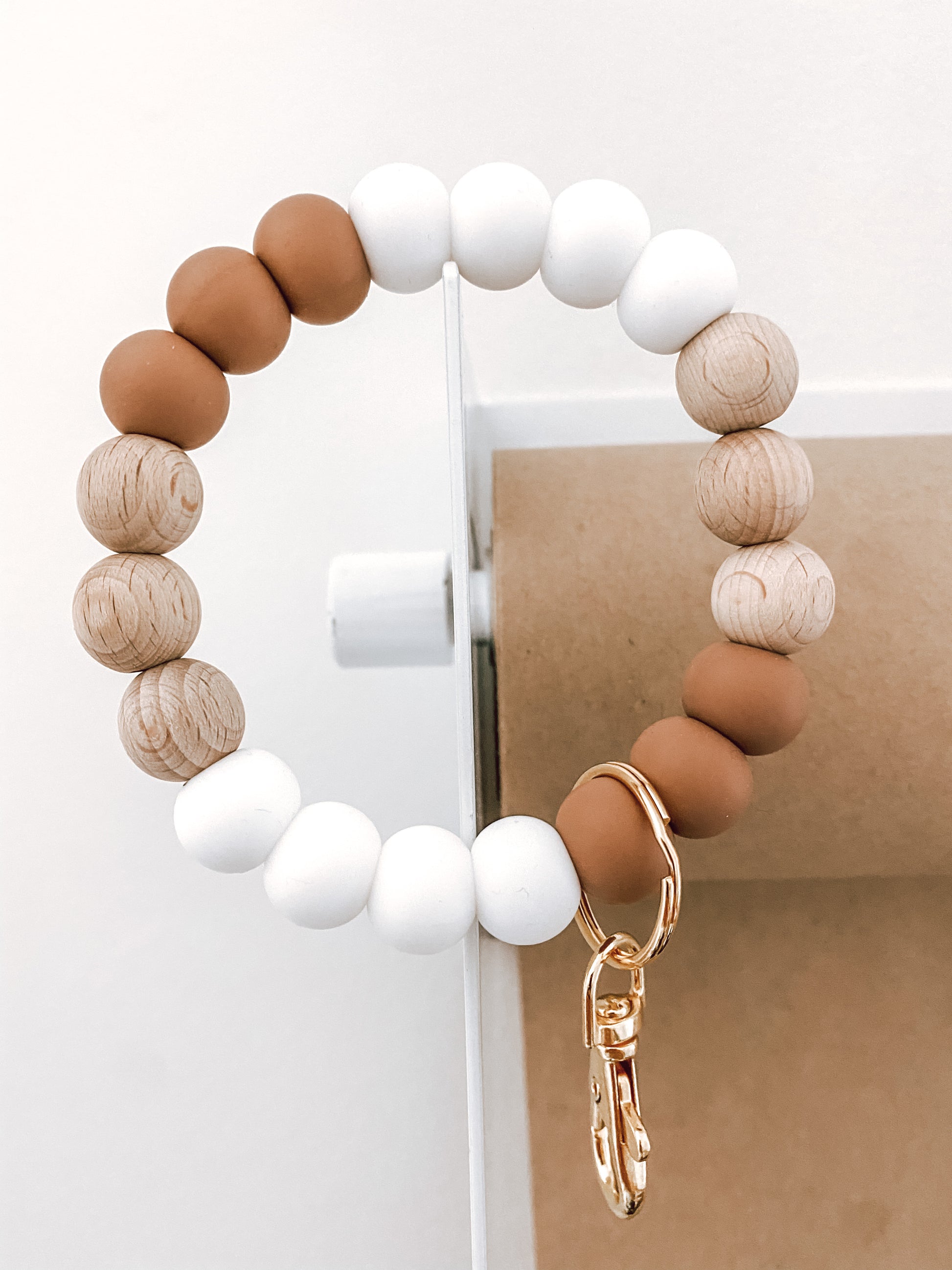 Thank you for your interest in a bracelet keychain. Never lose your keys again with this super functional piece. The main materials used in this item are food grade silicone beads- the perfect material to wipe down and sanitize.