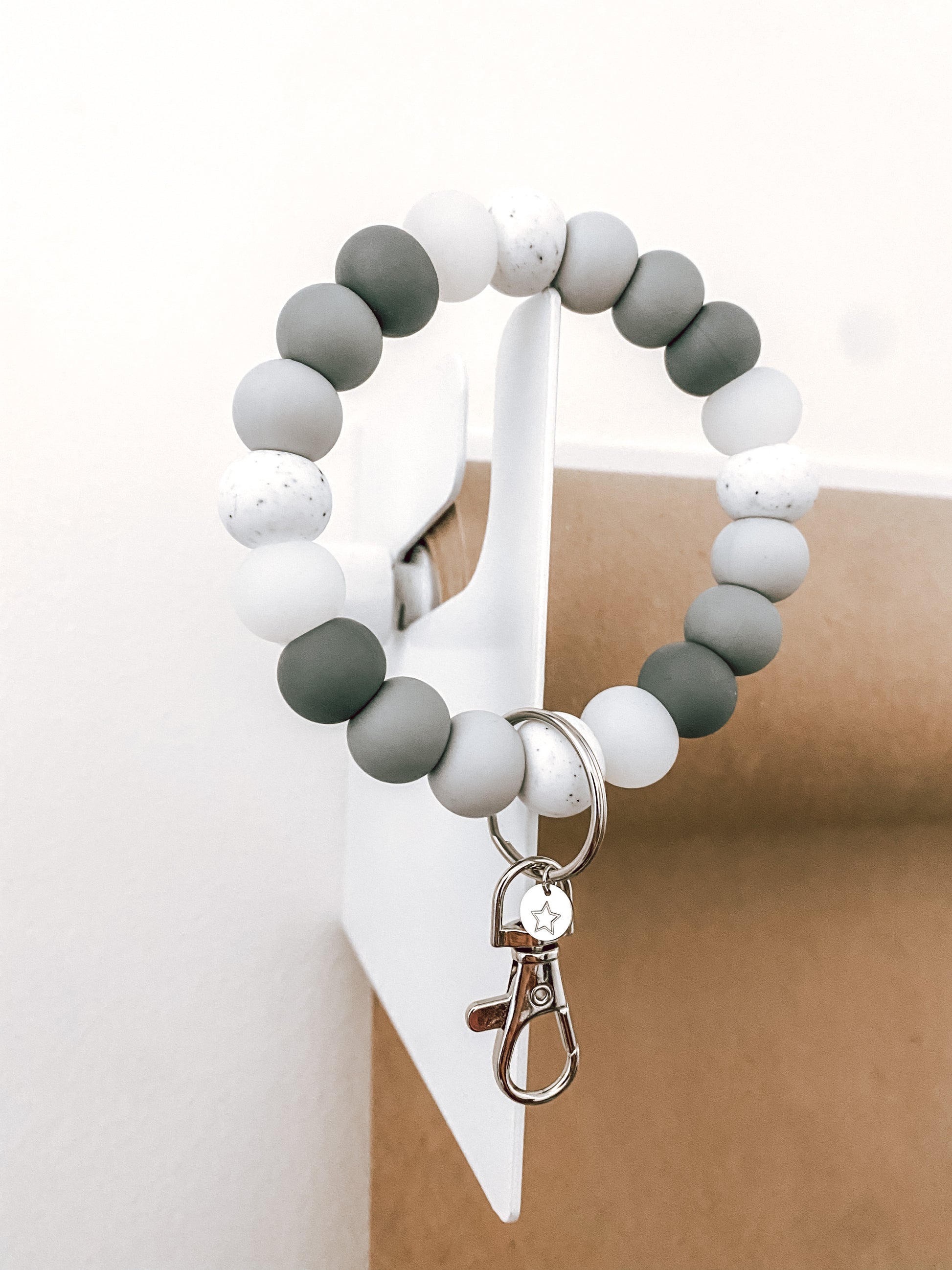 Thank you for your interest in a bracelet keychain. Never lose your keys again with this super functional piece. The main materials used in this item are food grade silicone beads- the perfect material to wipe down and sanitize.