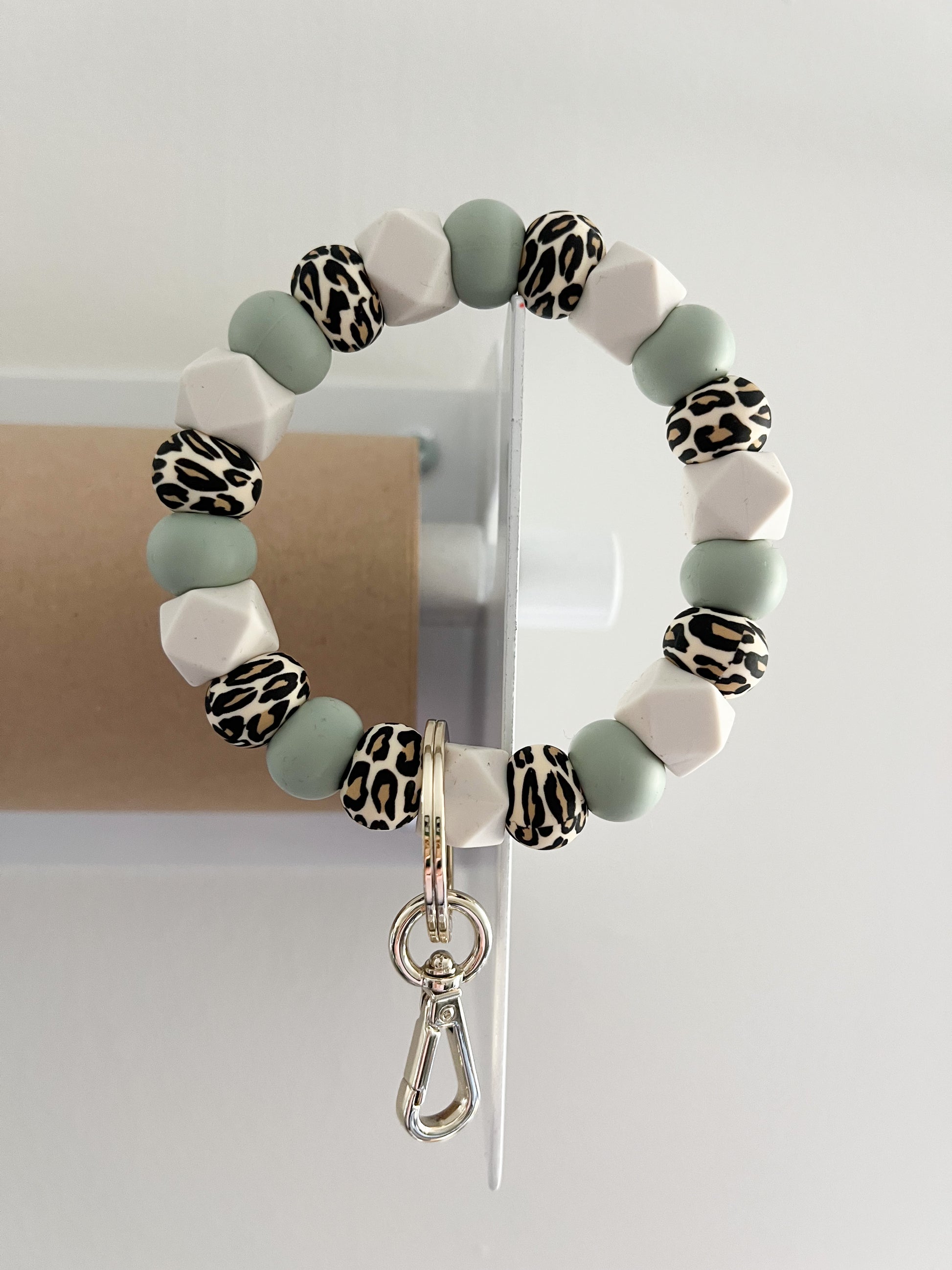 leopard, sage and ivory hexagon bracelet keychain