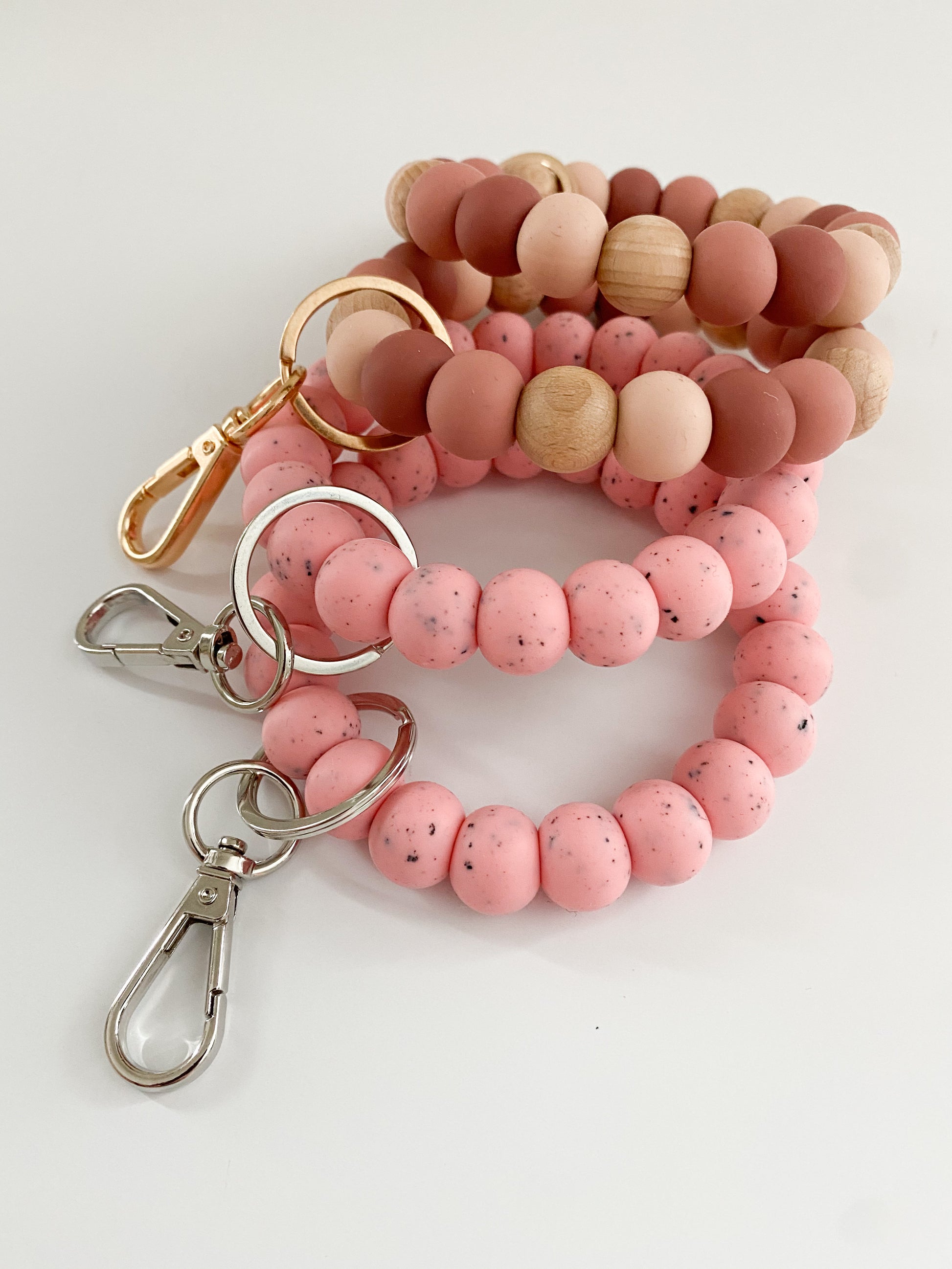 Thank you for your interest in a bracelet keychain. Never lose your keys again with this super functional piece. The main materials used in this item are food grade silicone beads- the perfect material to wipe down and sanitize.