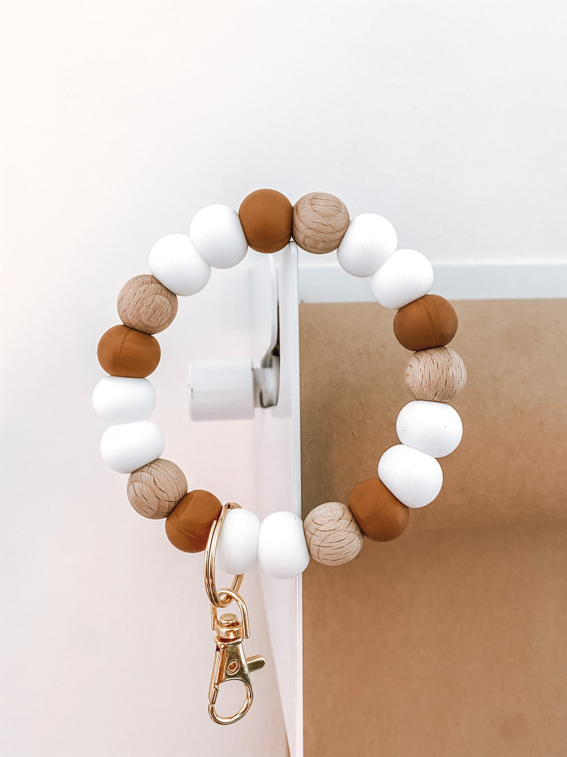 Thank you for your interest in a bracelet keychain. Never lose your keys again with this super functional piece. The main materials used in this item are food grade silicone beads- the perfect material to wipe down and sanitize.