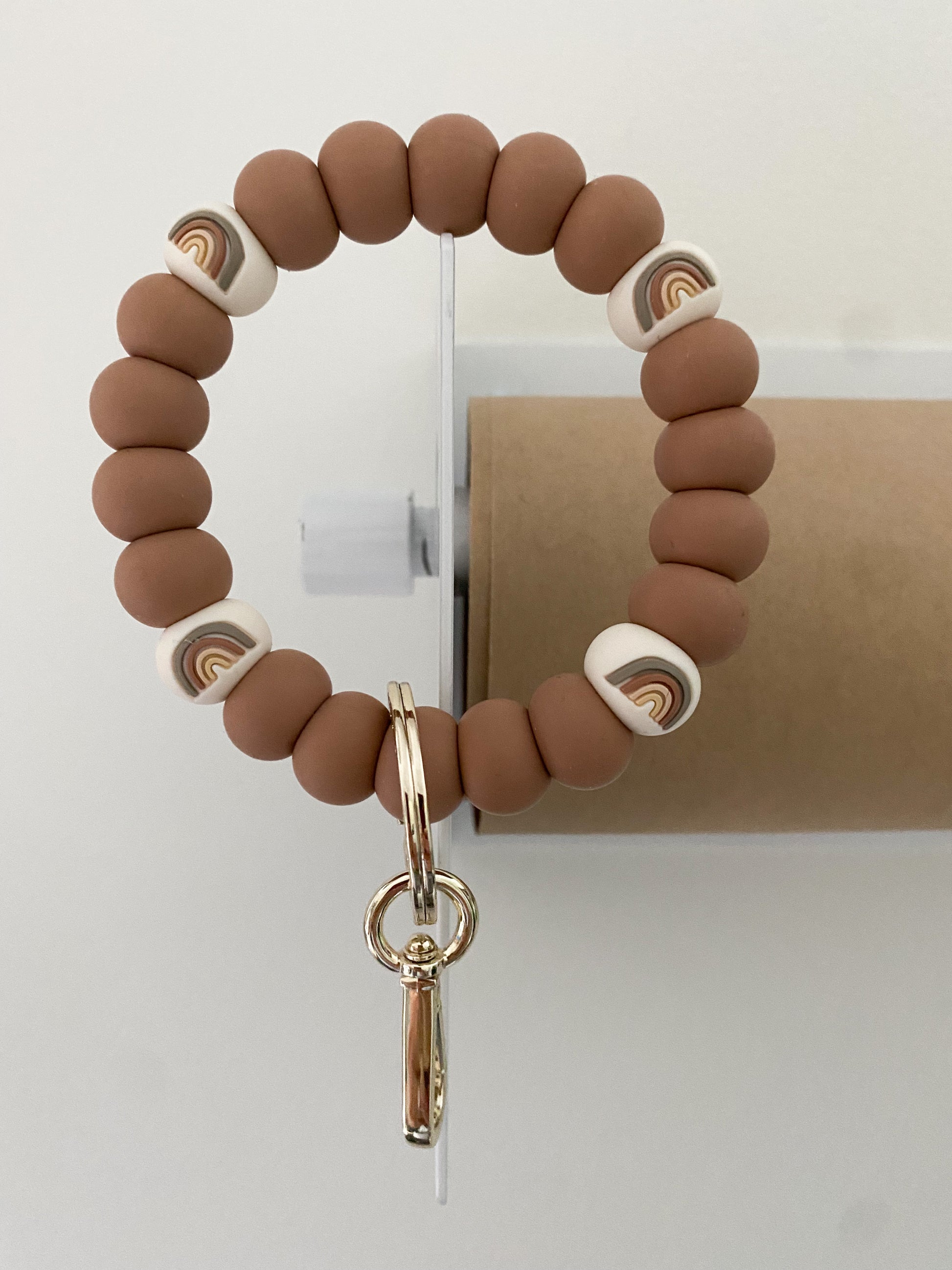 Thank you for your interest in a bracelet keychain. Never lose your keys again with this super functional piece. The main materials used in this item are food grade silicone beads- the perfect material to wipe down and sanitize.