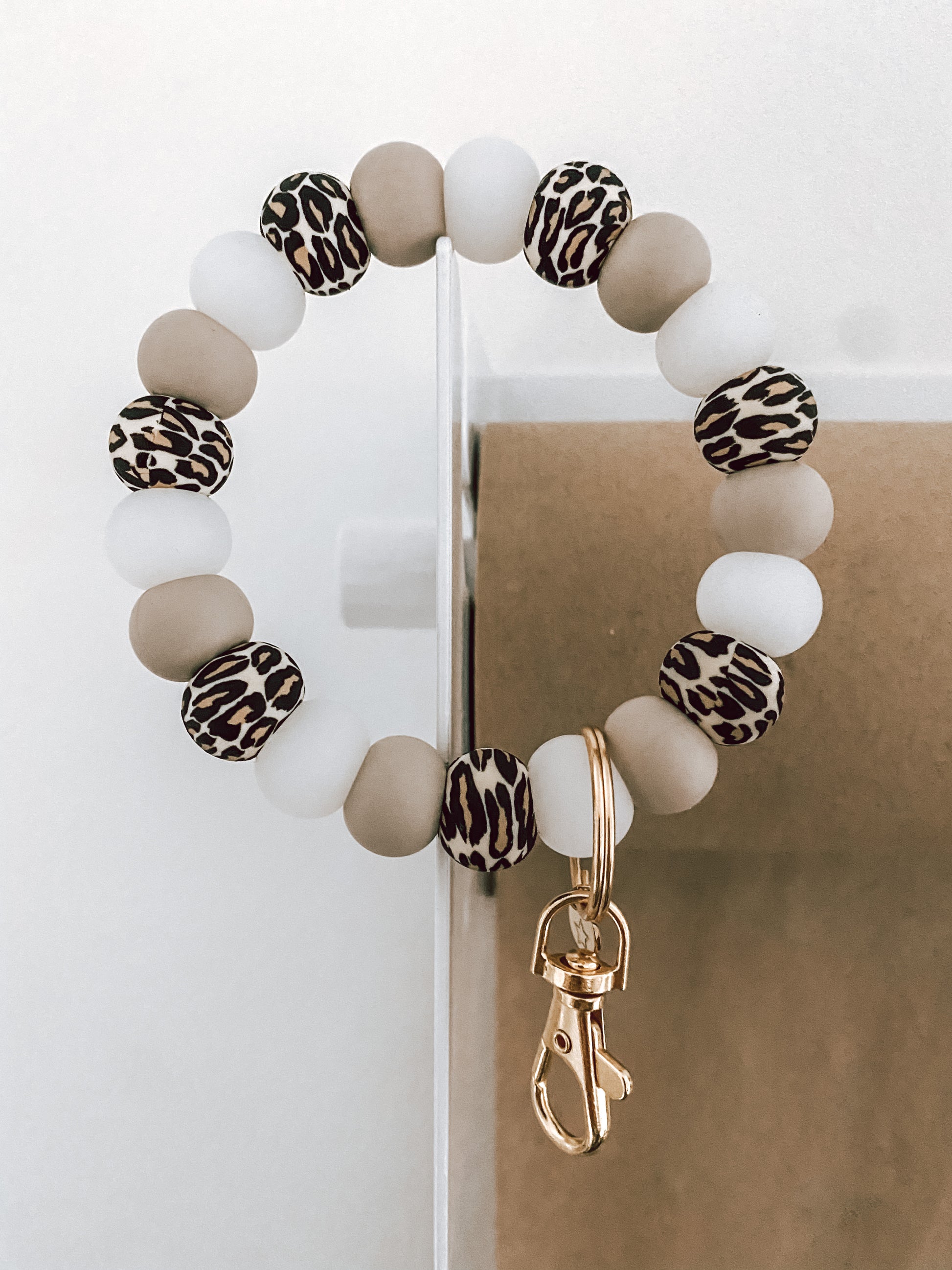 Thank you for your interest in a bracelet keychain. Never lose your keys again with this super functional piece. The main materials used in this item are food grade silicone beads- the perfect material to wipe down and sanitize.