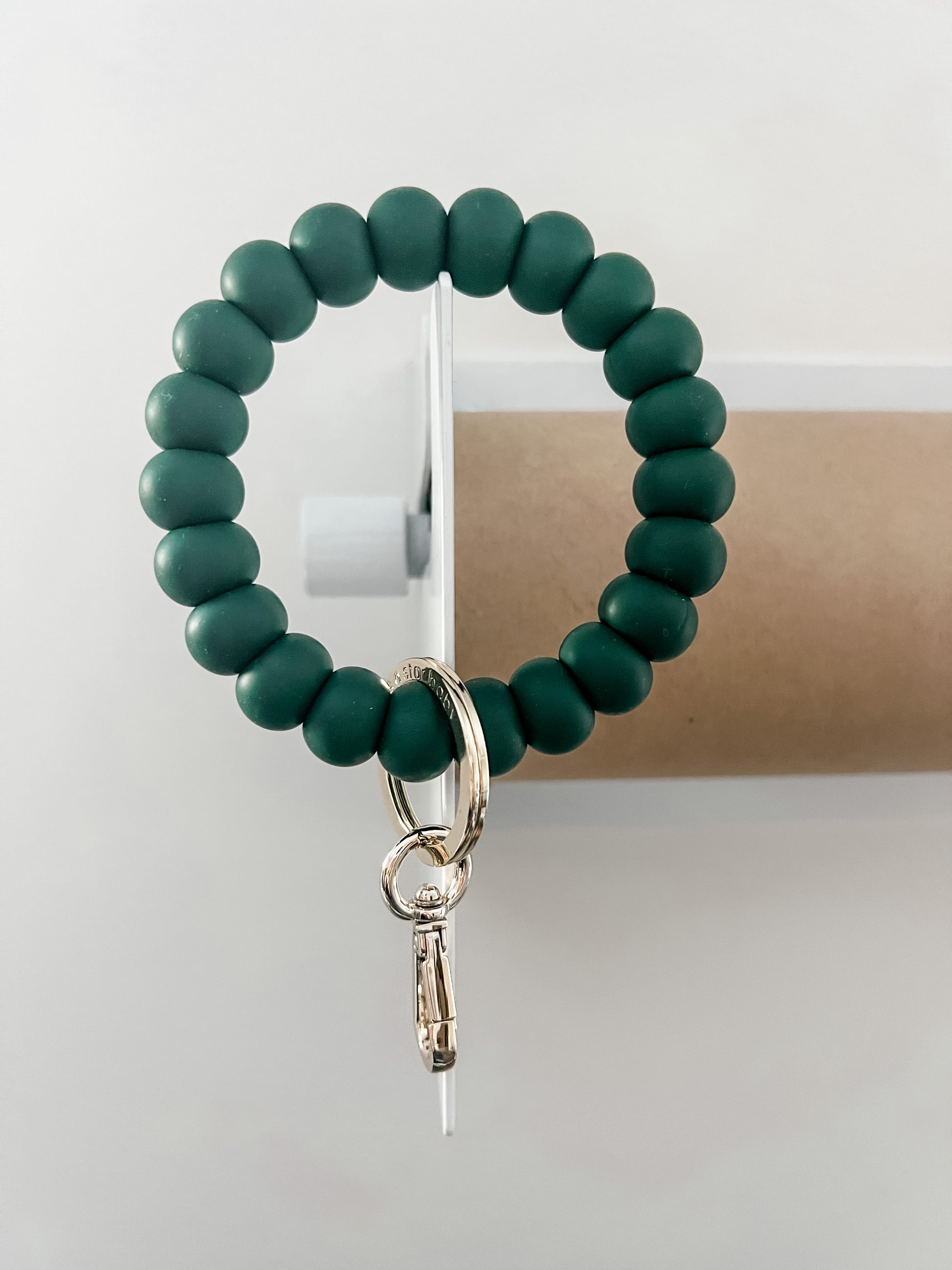 Thank you for your interest in a bracelet keychain. Never lose your keys again with this super functional piece. The main materials used in this item are food grade silicone beads- the perfect material to wipe down and sanitize.