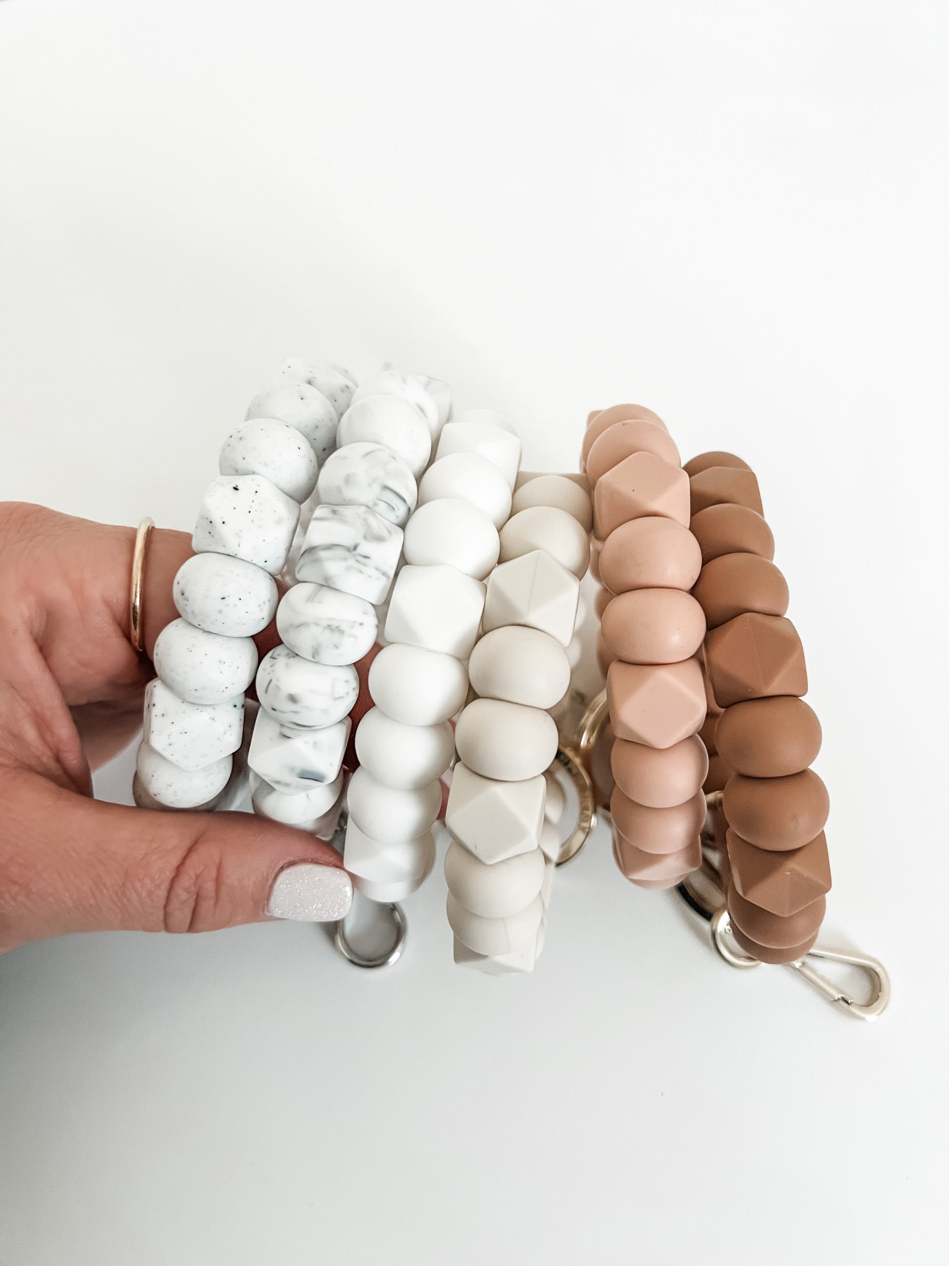 solid tone bracelet keychain in speckled white with small hexagons