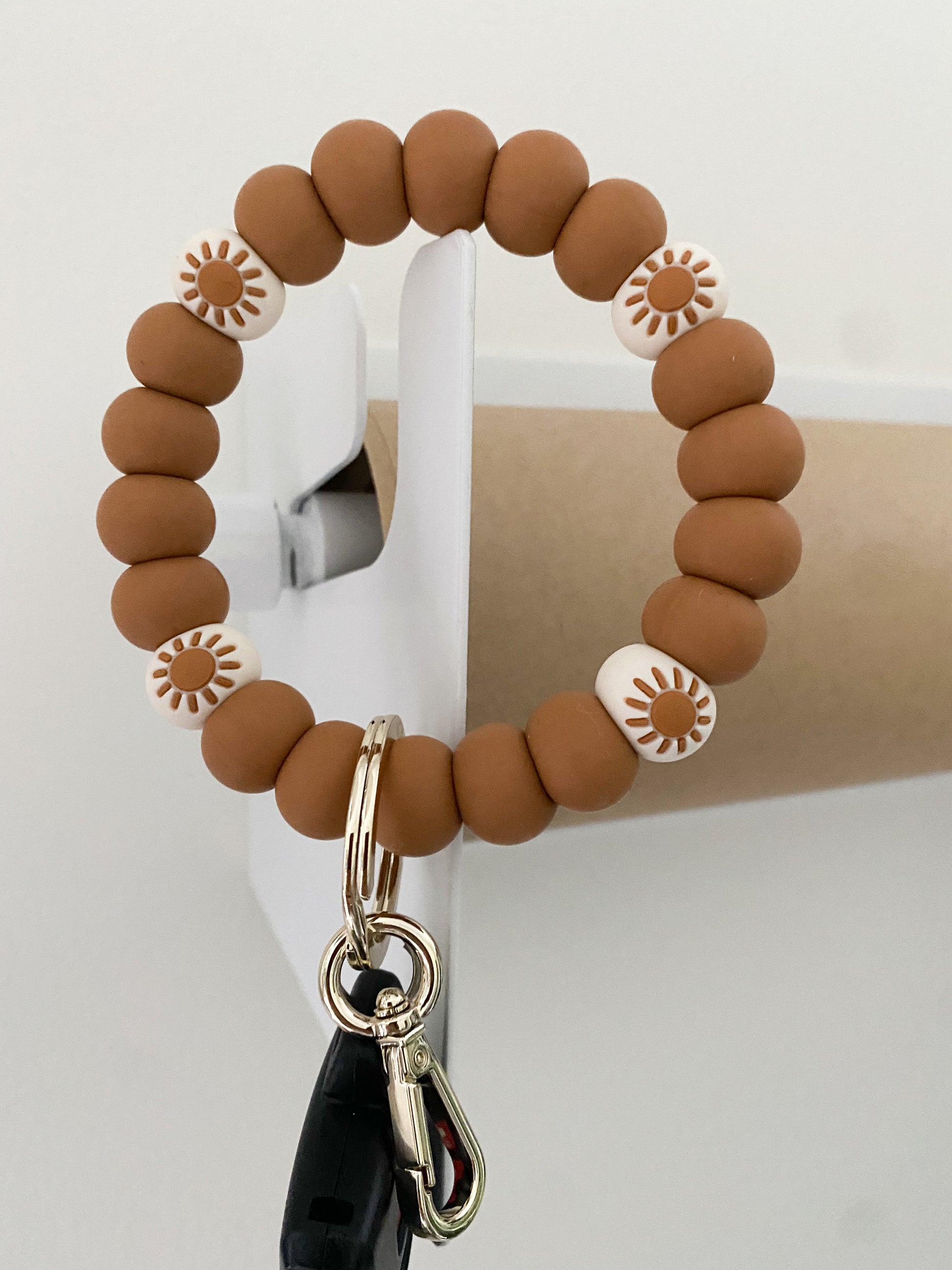 Thank you for your interest in a bracelet keychain. Never lose your keys again with this super functional piece. The main materials used in this item are food grade silicone beads- the perfect material to wipe down and sanitize.